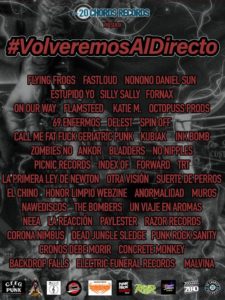 Desde Barcelona el sello 20 CHORDS RECORDS propone la consigna #VOLVEREMOSALDIRECTO refiriéndose al momento en que las bandas puedan volver a subirse a un escenario con la clara idea de mantener la escena lista para resurgir con más potencia después de la pandemia y reflexionar sobre la necesidad de apoyar las escenas locales, las salas para realizar shows, sellos independientes y pequeños promotores.